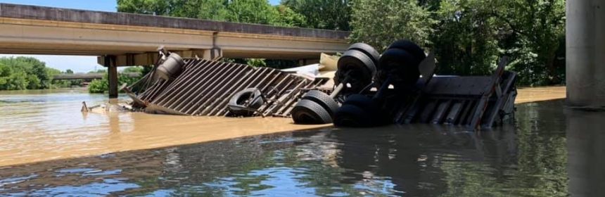 An 18-wheeler traveling along the highway crashed off the bridge and into the creek below.